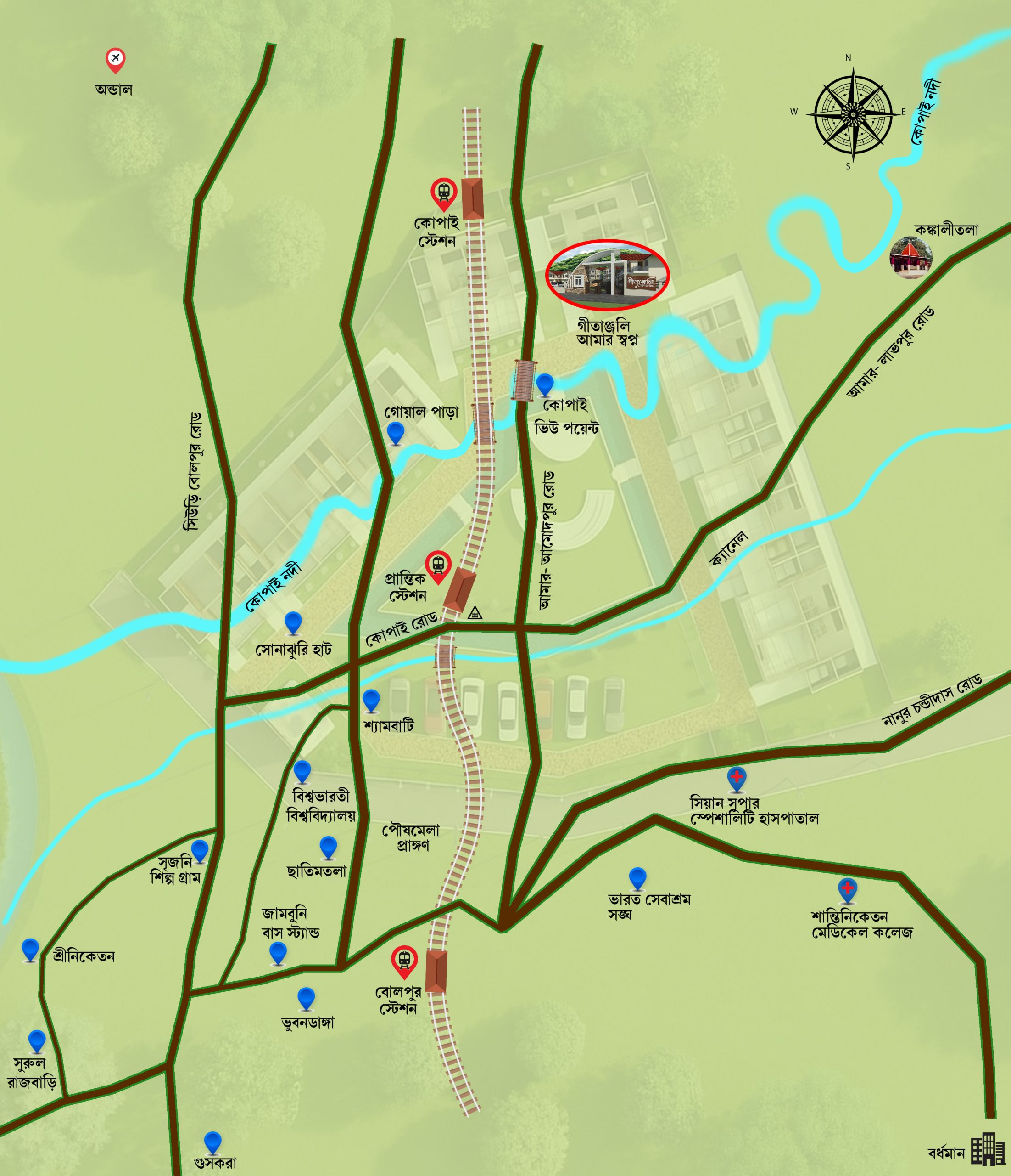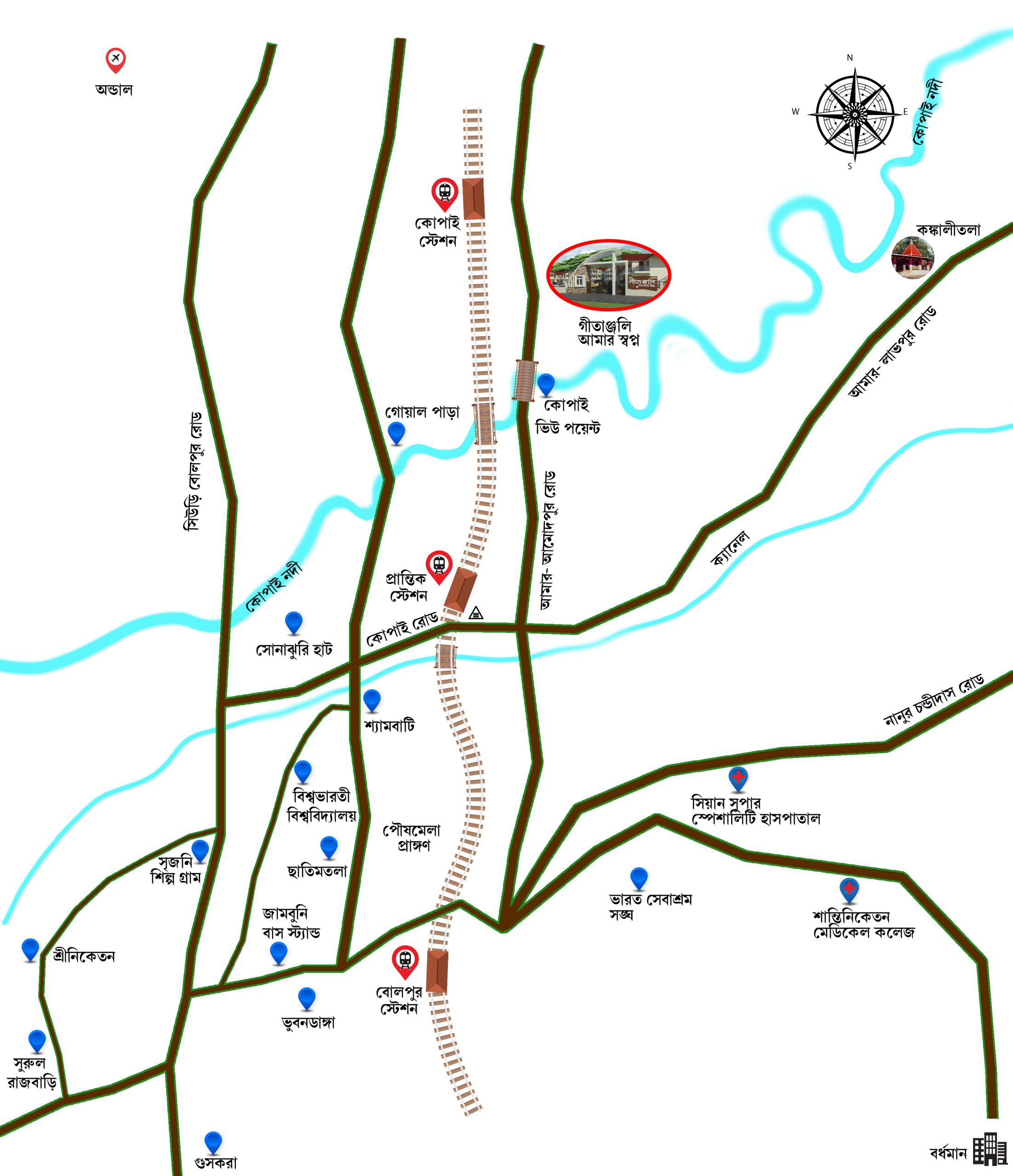 | শান্তিনিকেতন মেডিকেল কলেজ ৩০ মিনিট (১২ কি.মি.) | |